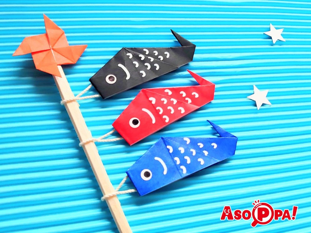 折り紙1枚で簡単に作れるこいのぼりのご紹介! 色や大きさを変えて、お父さん鯉、お母さん鯉、子どもの鯉を作って飾りましょう♪