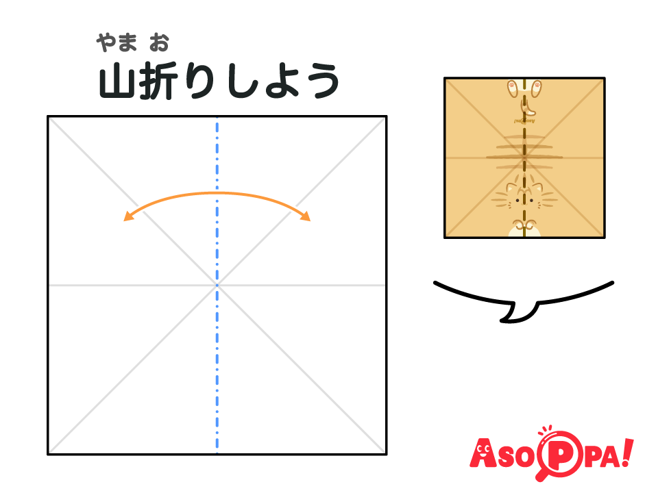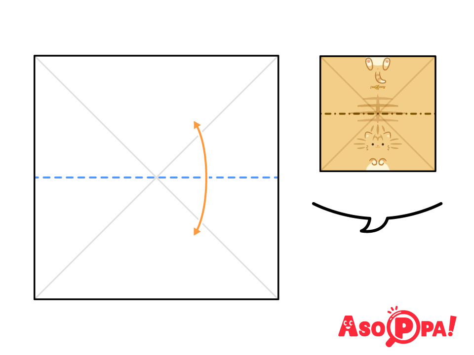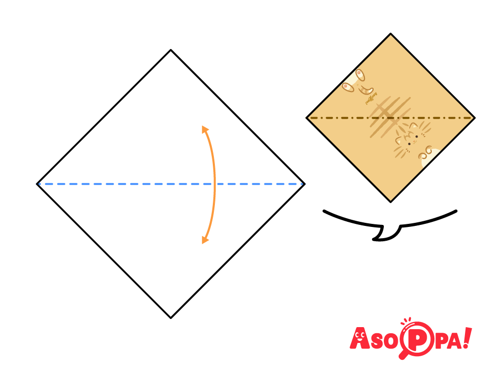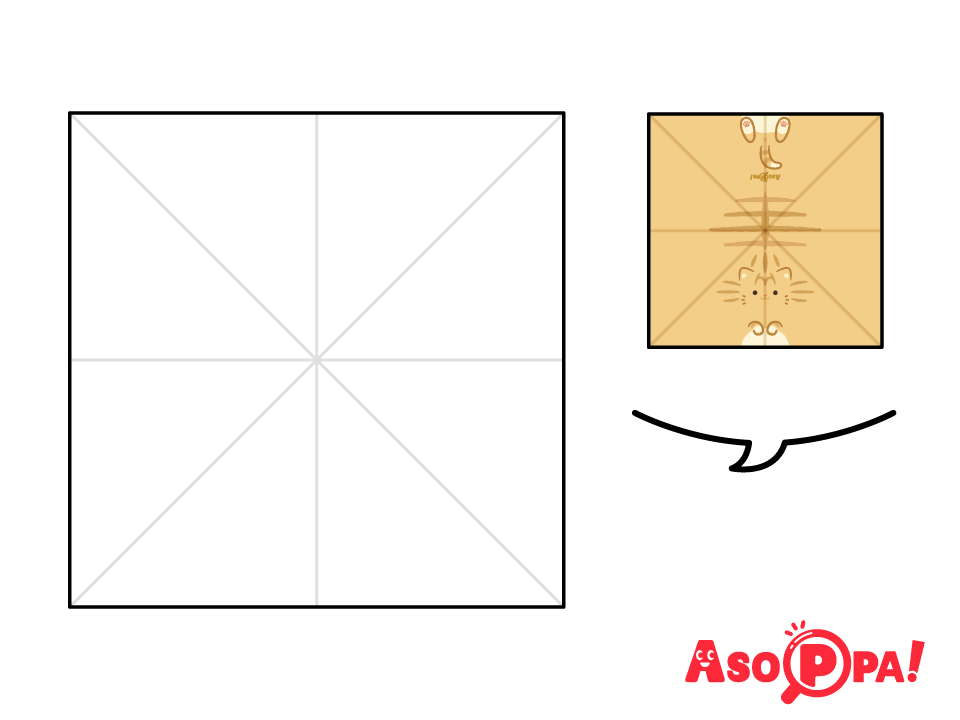 ・折る工程の絵柄を見ながら折りましょう。違う向きで折ると完成時に顔が出なくなってしまうので注意してくださいね。