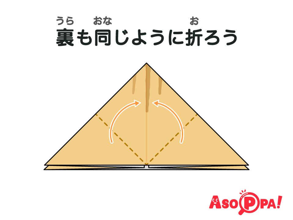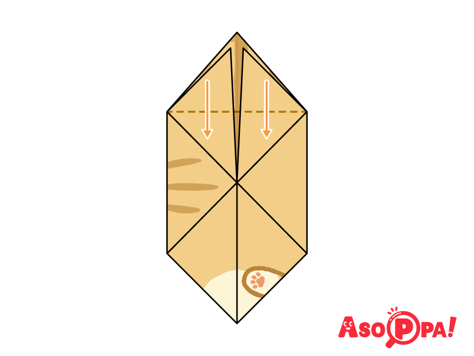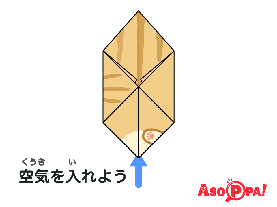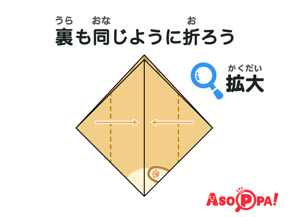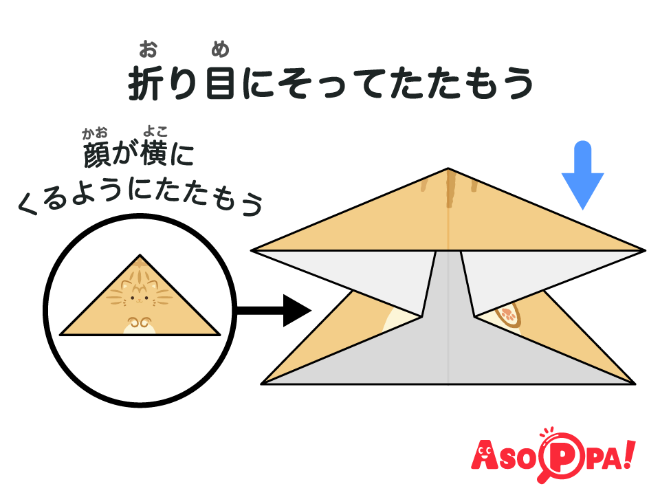 ・折る工程の絵柄を見ながら折りましょう。違う向きで折ると完成時に顔が出なくなってしまうので注意してくださいね。