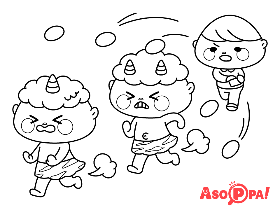 節分の豆まきの塗り絵です。鬼は外!福はうち!と元気に豆をまいて鬼を退治しましょう。