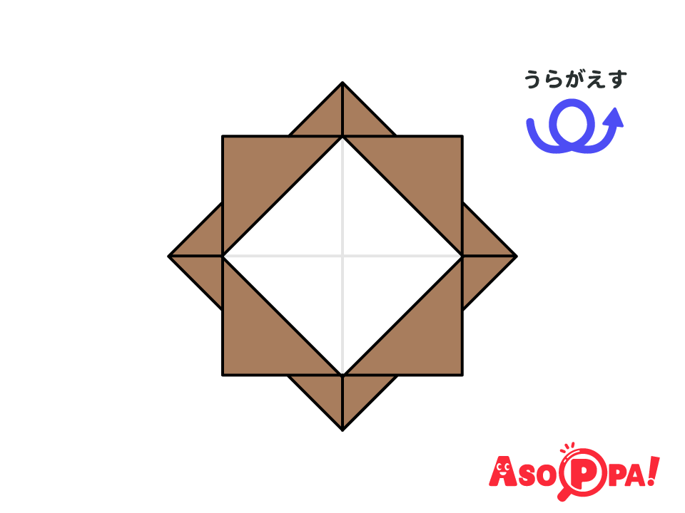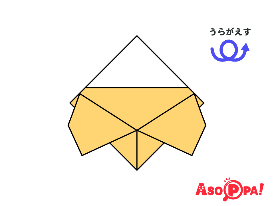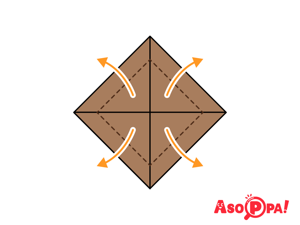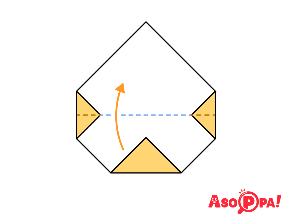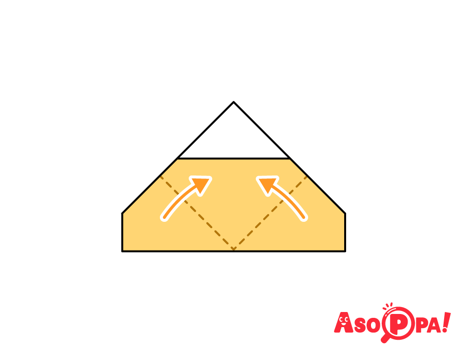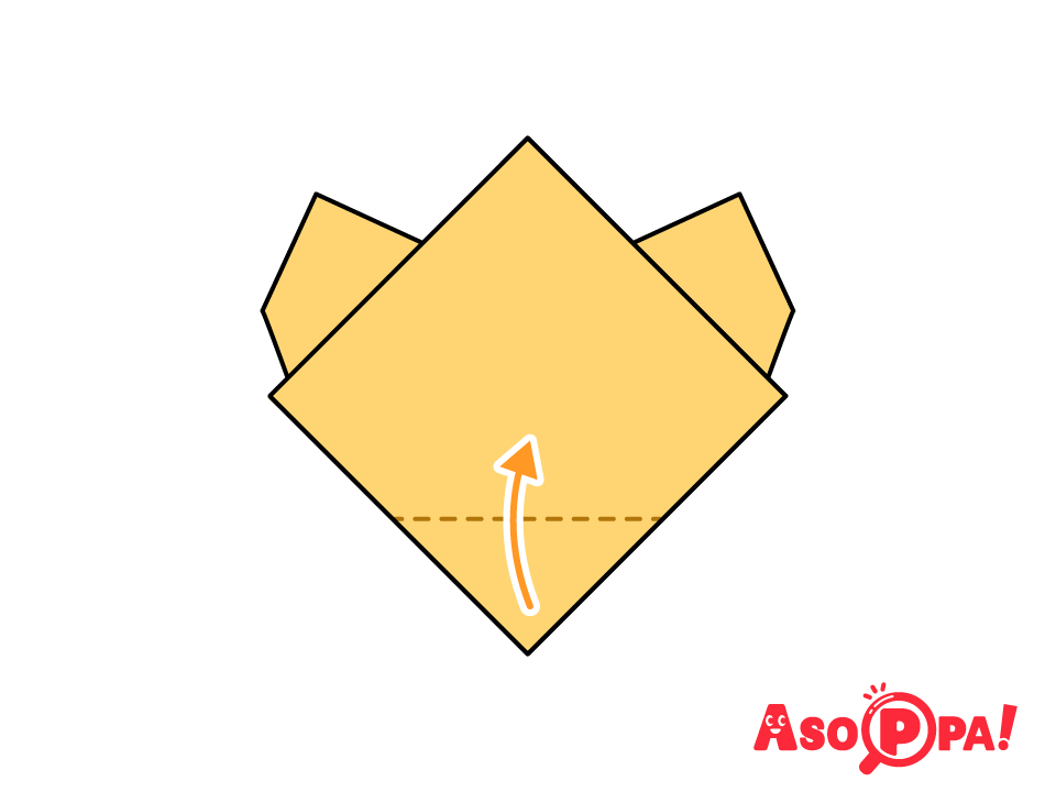 点線で谷折りする。工程①より少し小さめの三角に折る。 -