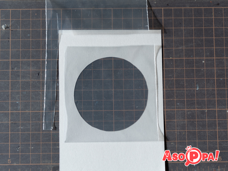 カッターで円を切り抜き、円を作ります。これが、スノードームのドーム部分になります。 -