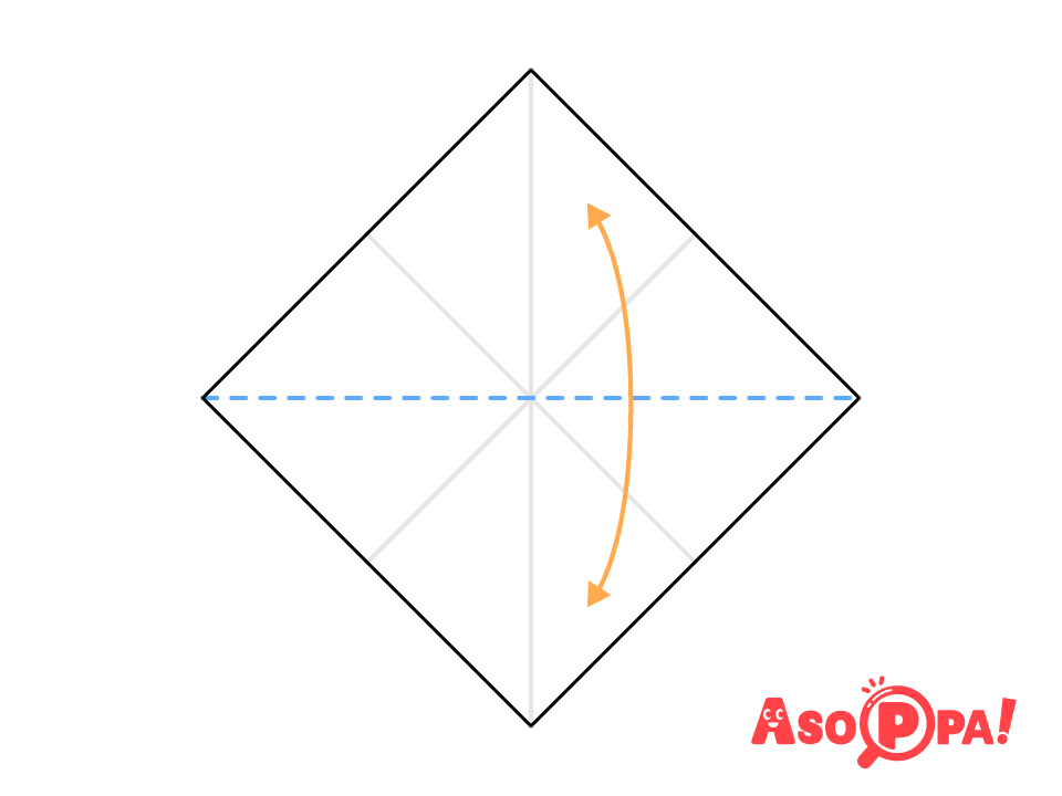 縦に三角に半分に折り、折り目を付けて開く。 -