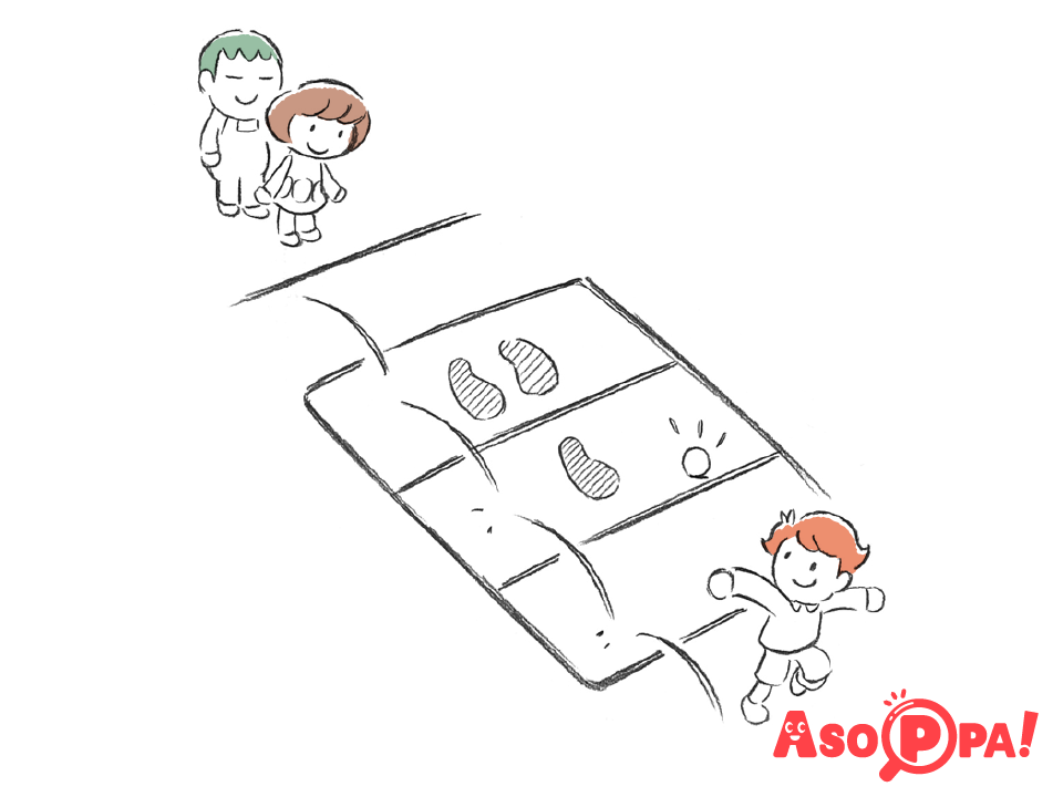 玉を的に向かってなげ、その的の通りに走ったり、ジャンプしたりしながら行うリレーです。