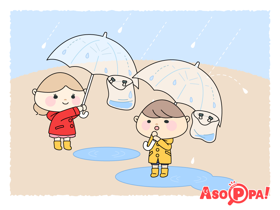 親としては大変なのは分かりますが、子どもにとっては貴重な体験です。レインコートや傘、長くつを準備して、さぁ、雨遊び開始です☆