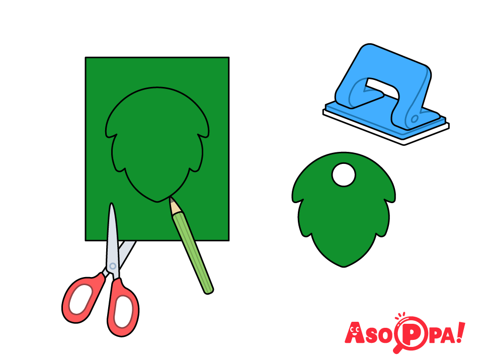画用紙で葉っぱを作り、穴あけパンチで穴を開ける。 -