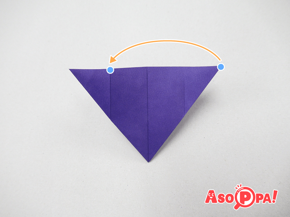 右の角を中心に合わせるように、点線の位置で谷折りする。 -