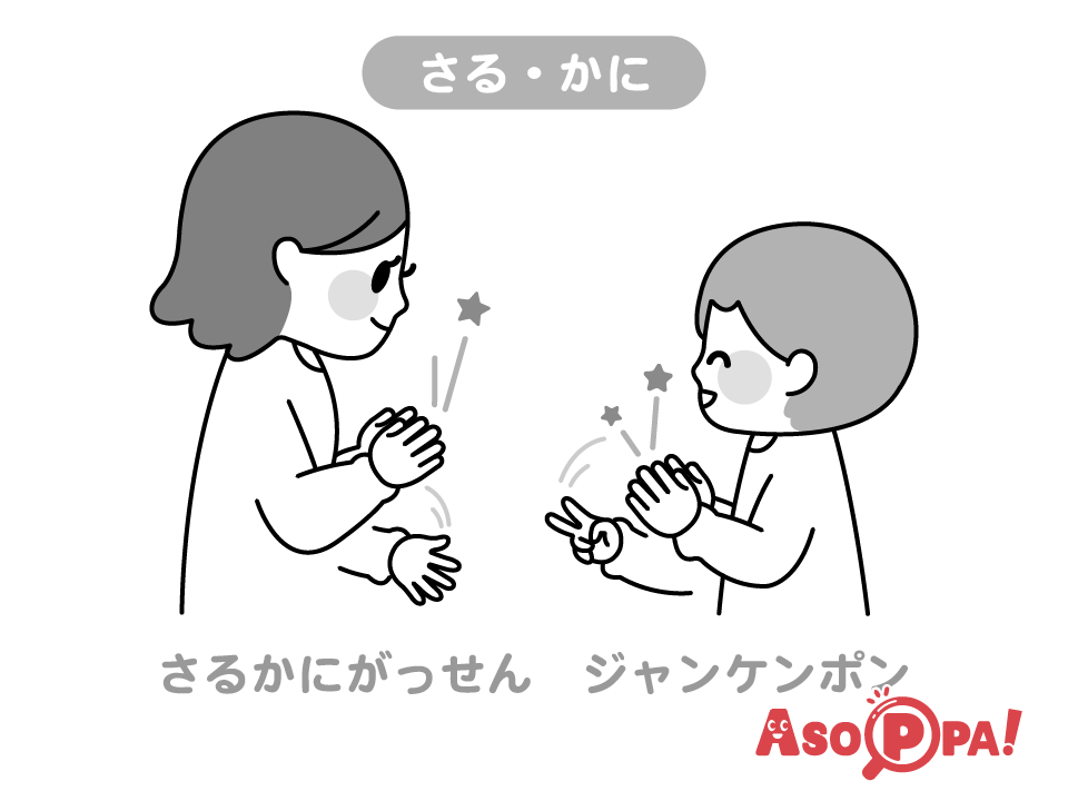 サルとカニに分かれてジャンケンであそびます。ジャンケンができない子には手遊びとしても楽しめます