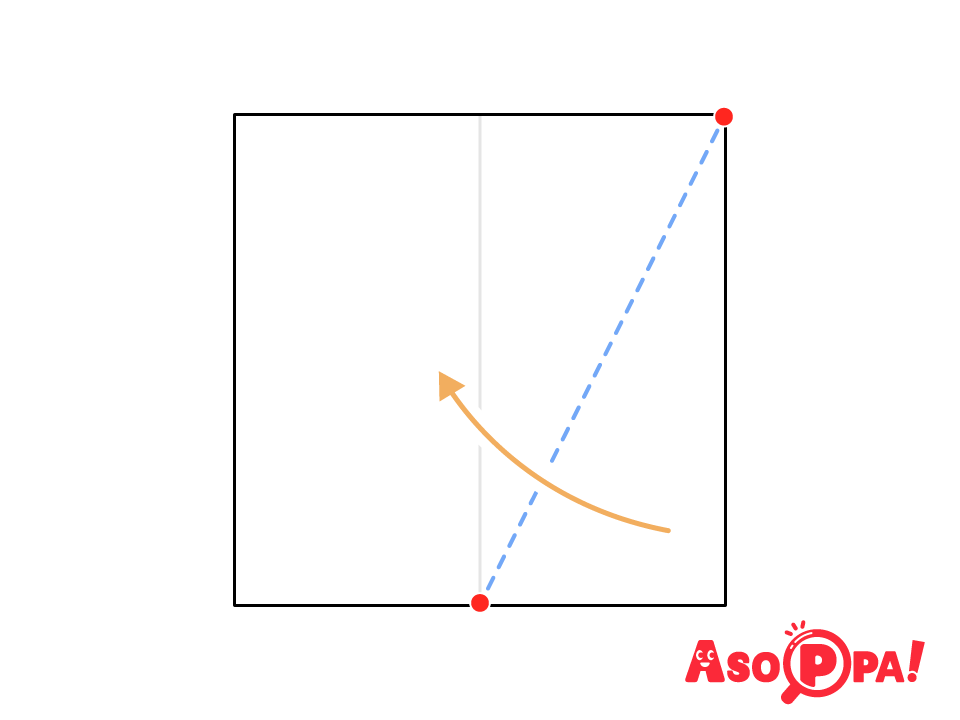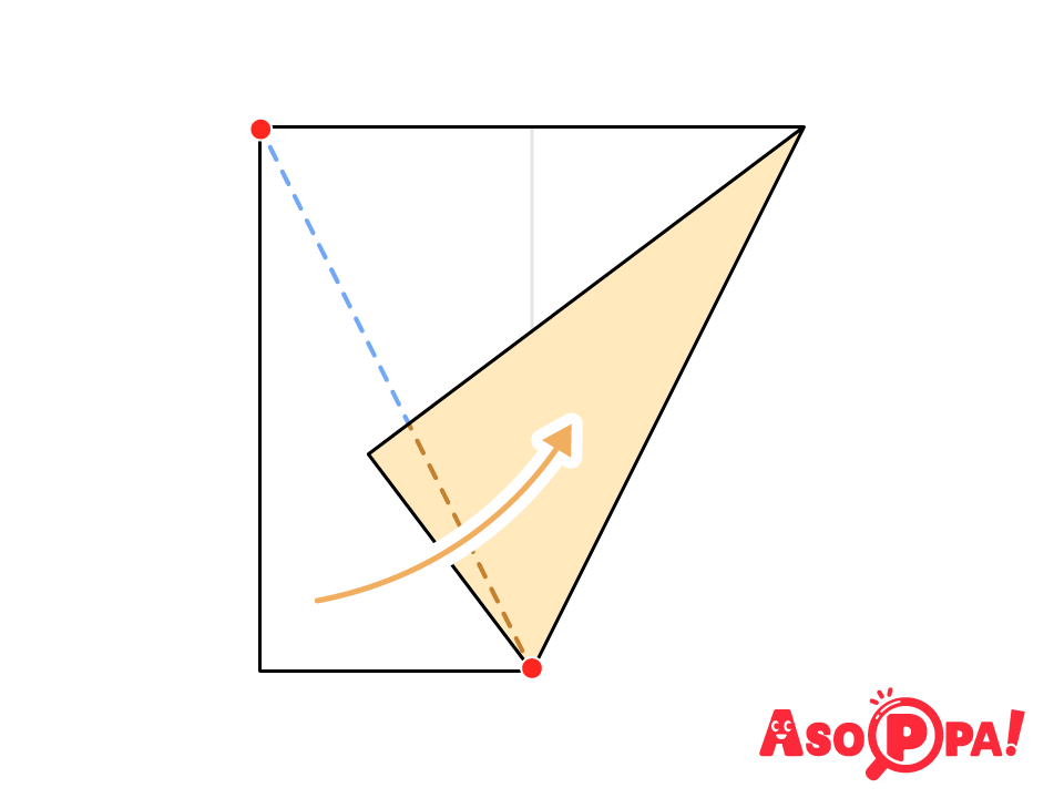 点線で谷折りする。右上の赤い●と真ん中の赤い●が一直線になるように折ろう。 -