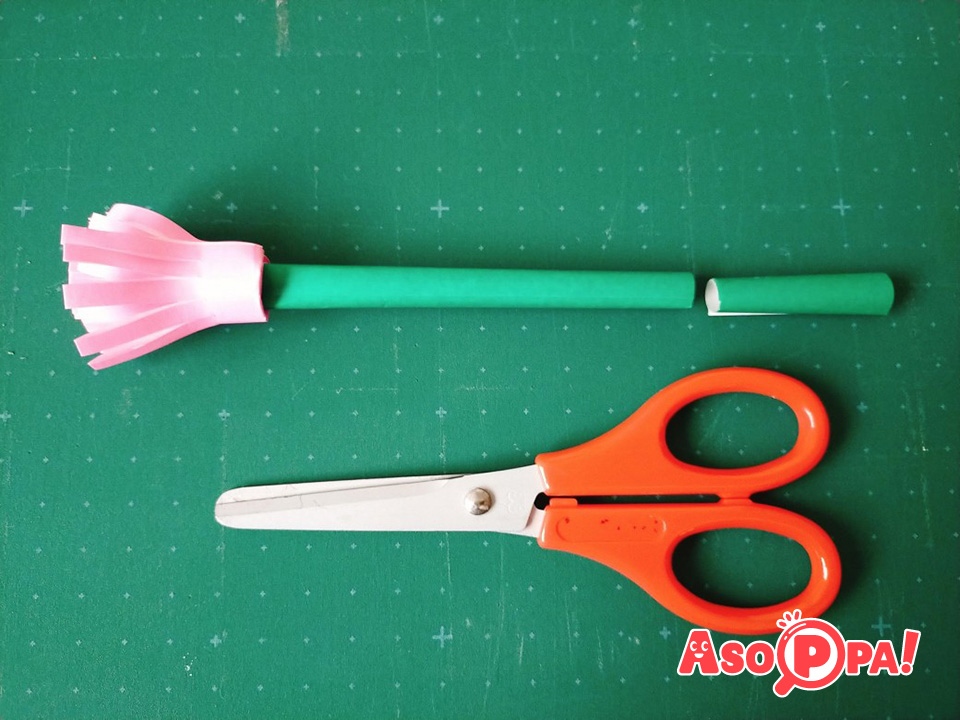 しっかりとくっついたことを確認したら、えんぴつを抜きます。これで、カーネーションの茎ができました。 -