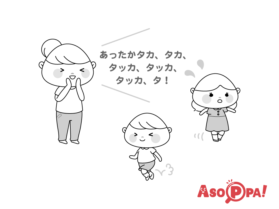 声に合わせて体を動かしましょう。広くなくてもできて、体も温まるあそびです。外で運動できない時も楽しめます。