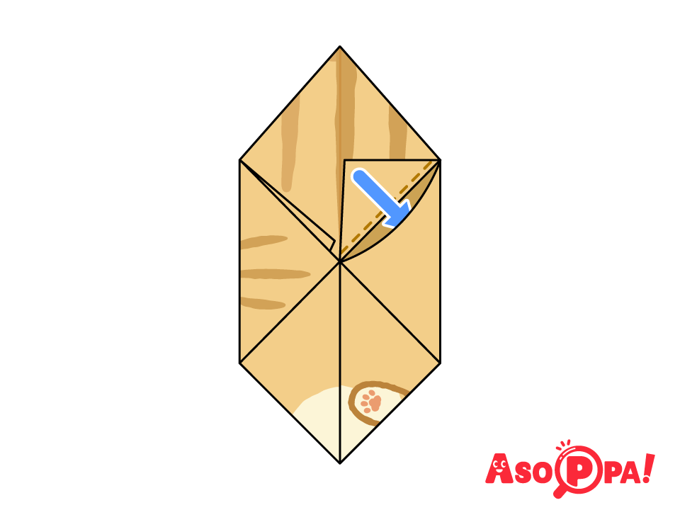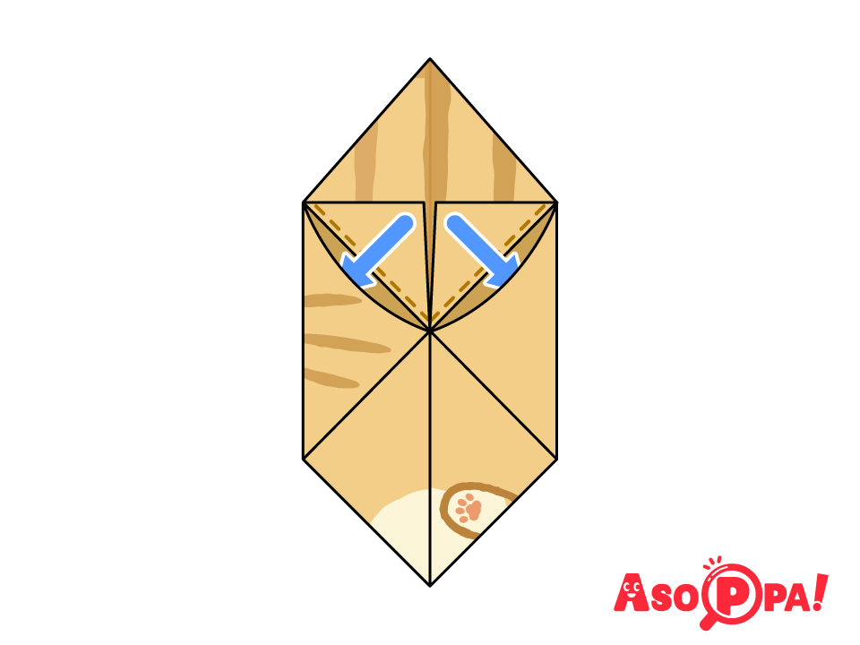 ・折る工程の絵柄を見ながら折りましょう。違う向きで折ると完成時に顔が出なくなってしまうので注意してくださいね。