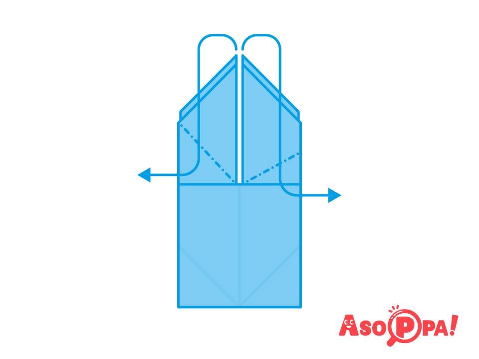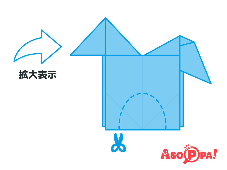 点線で山折りになるよう、下の矢印の位置から開き、左に折りたたむ。 -