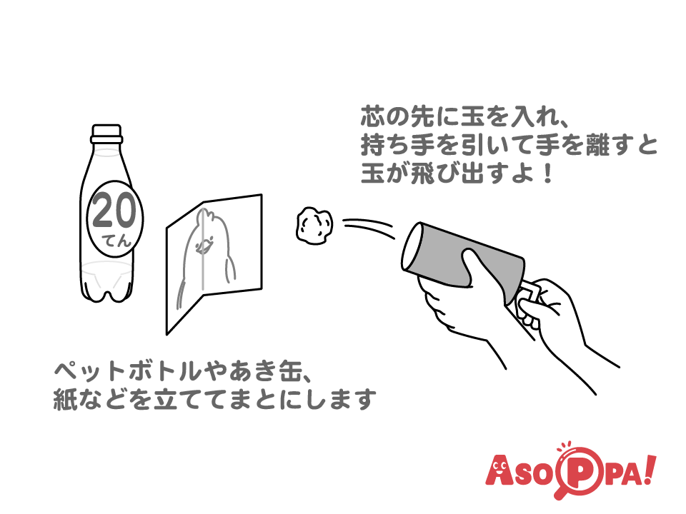 トイレットペーパーの芯を使って、簡単に的当てが作れます。丸めた玉を飛ばし、様々な的を作って遊びましょう。