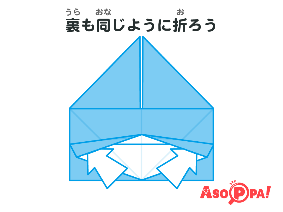 手前の紙を内側に折り込むように、点線で山折し、裏側も同様に折る。 -
