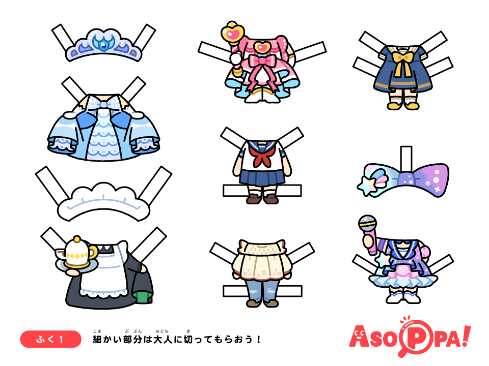 切り抜いて遊べる着せ替え人形です!作り方に載っているイラストを無料ダウンロードして、印刷して使ってくださいね。
