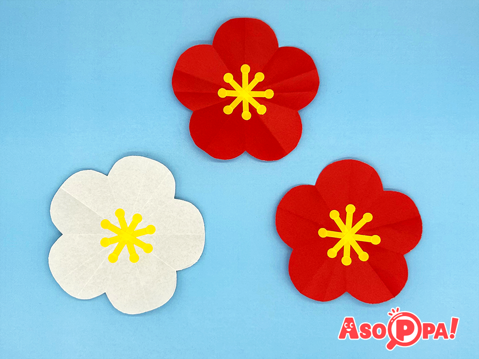 赤や白の折り紙で花の形を作ると、簡単に梅の花のようになります♫
