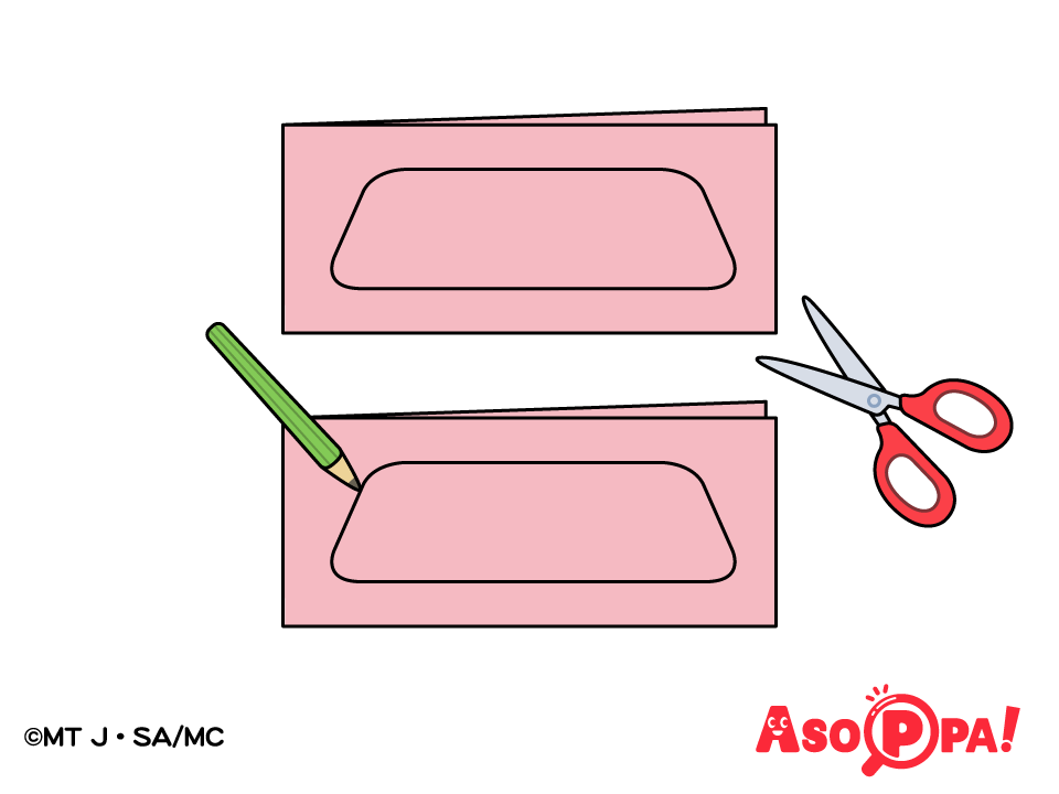 ピンクの画用紙を半分に折って窓の形を描き、はさみで切る。(2つ作り、窓が4つできる) -