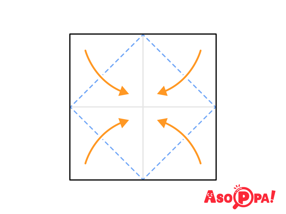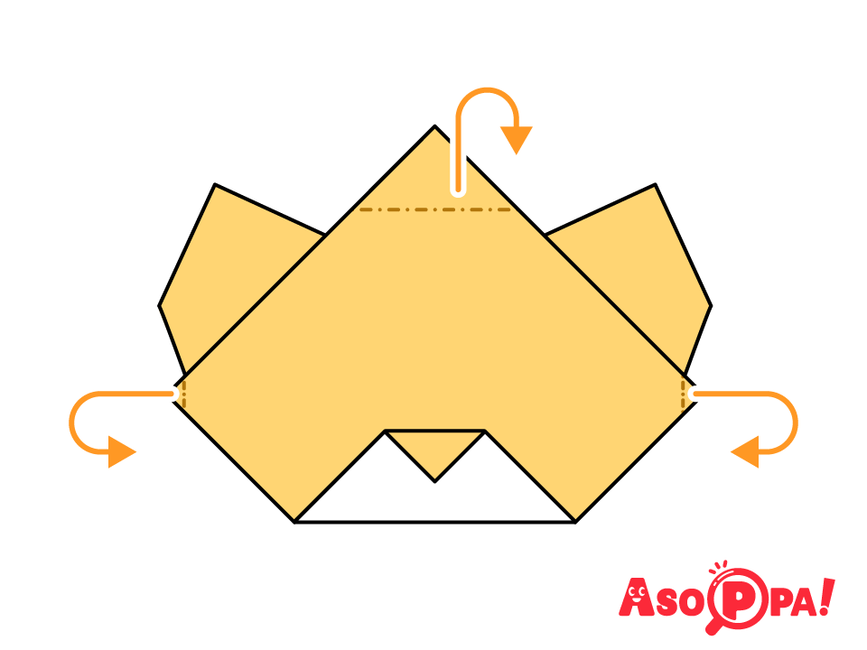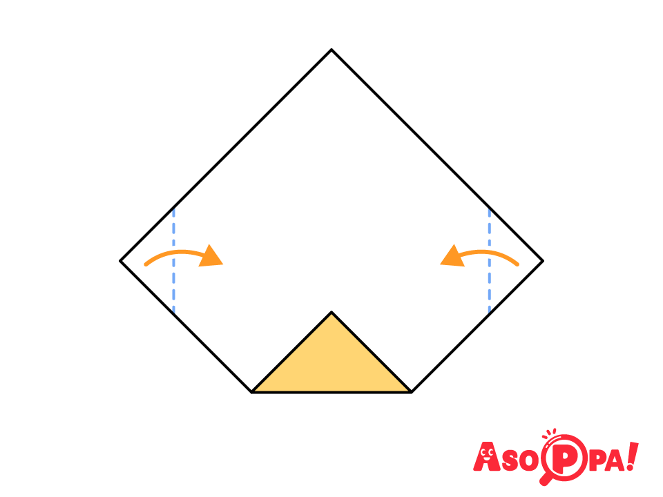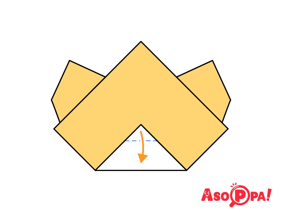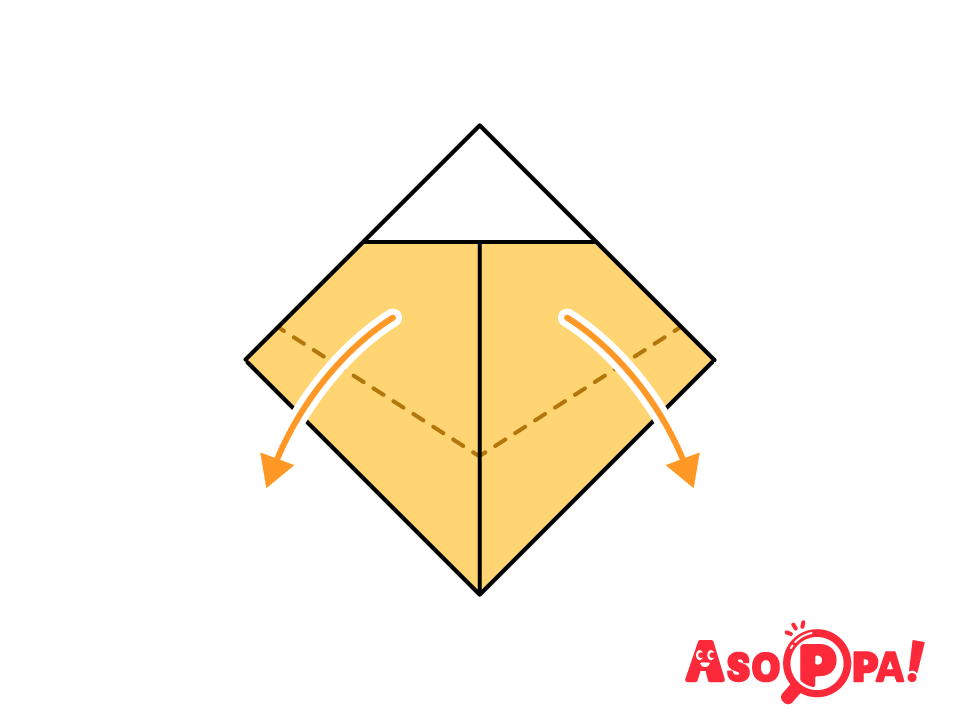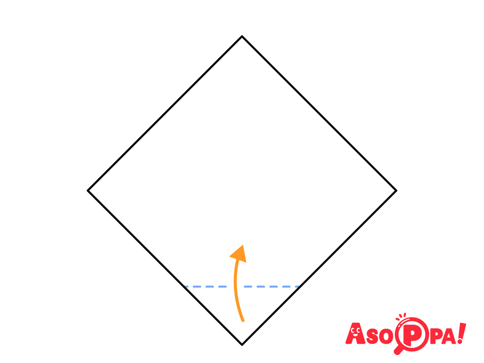 点線で谷折りする。工程①より少し小さめの三角に折る。 -