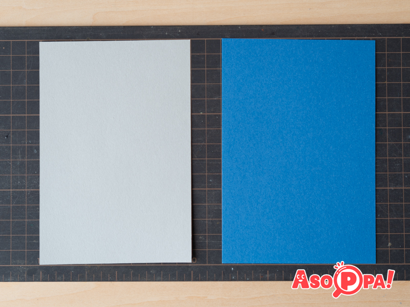 2色の色画用紙を、ポストカードサイズ(100mm*14.8mm)にカットします。1色は薄い色、1色は濃い色にするのがおすすめです。 -