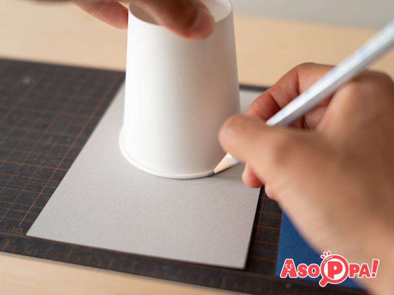 薄い色の色画用紙の中心より少し上に、7cmほどの直径の円を描きます。紙コップをなぞるとちょうど7cmですが、他の丸いものや、コンパスで円を描いてもOKです。 -