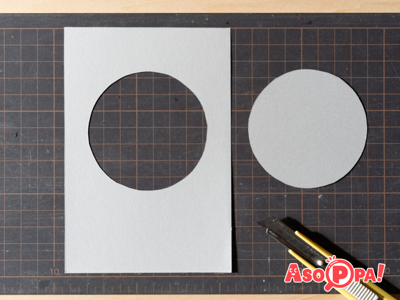 カッターで円を切り抜き、円を作ります。これが、スノードームのドーム部分になります。 -