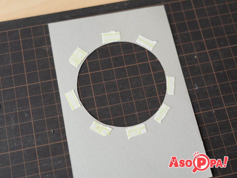 円の縁に、小さくカットした両面テープをぐるっと一周貼ります。 -