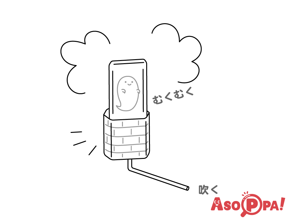 ポリ袋をトレーの中に入れてストローから息を吹き込むと、袋がむくむくと伸び上がって蜃気楼のように見える。