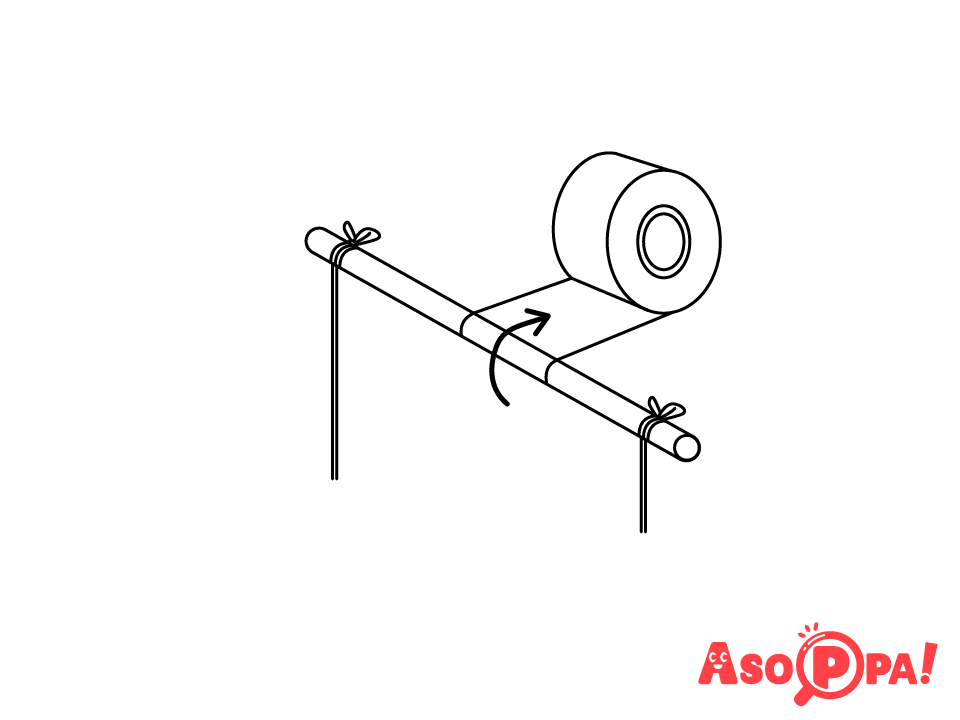 図のように穴をあけ、たこ糸を通して両側をテープでおさえてつなぎます。 -