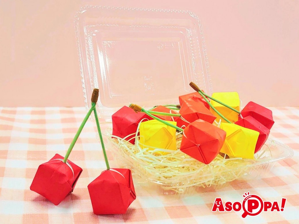 風船の折り方で立体的なさくらんぼが作れちゃうんです。小さめの折り紙を使って作るとちょうどいいサイズが作れますよ。 -
