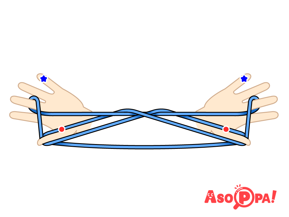 ひだりての なかゆび(★)で みぎての なかゆび(●)の ひもを とる。 -