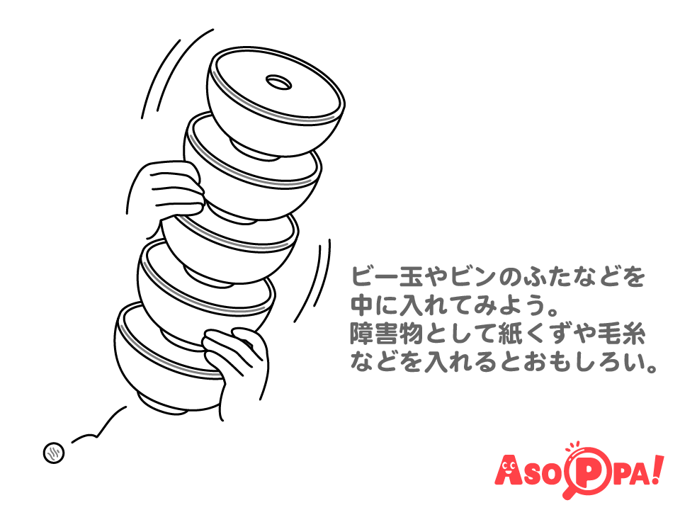 カップめん容器の組み合わせ方は、自由に工夫してみましょう。組み合わせ方や穴の位置などによって、難易度を変えて楽しむことができます。