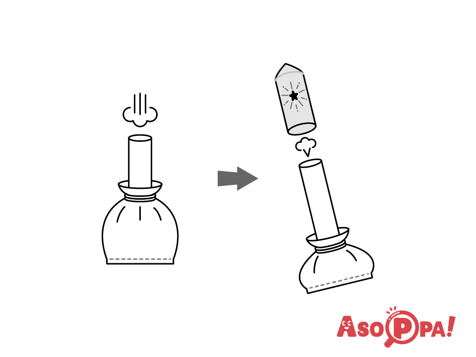 芯をゴムで留めた部分を片手で持ち、もう片方の手で袋の底を下から真上に向かって叩くとポンと音を立てて筒が発射する。