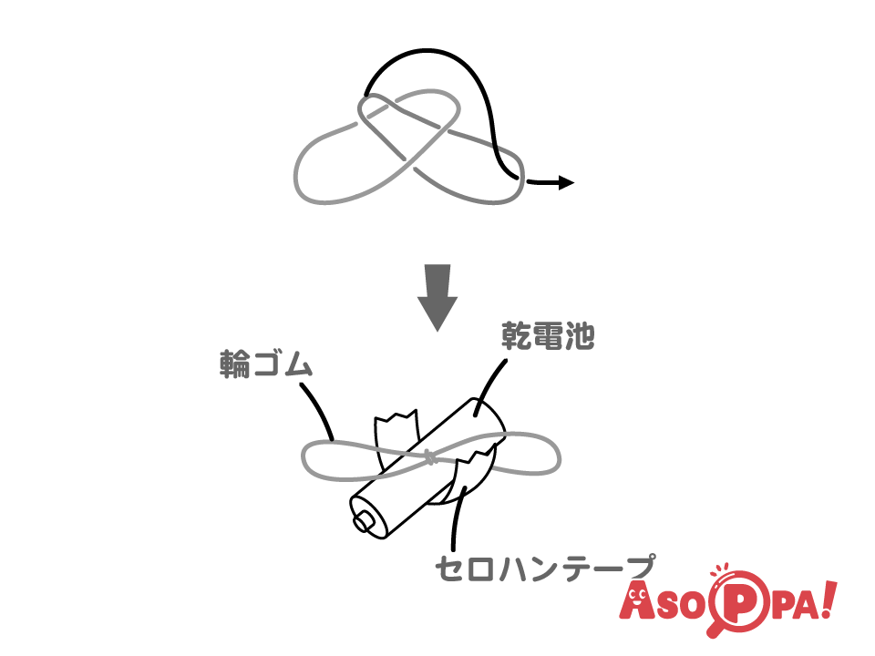 輪ゴムを2本繋ぎ、乾電池を斜めに置いてセロハンテープで固定する。 -