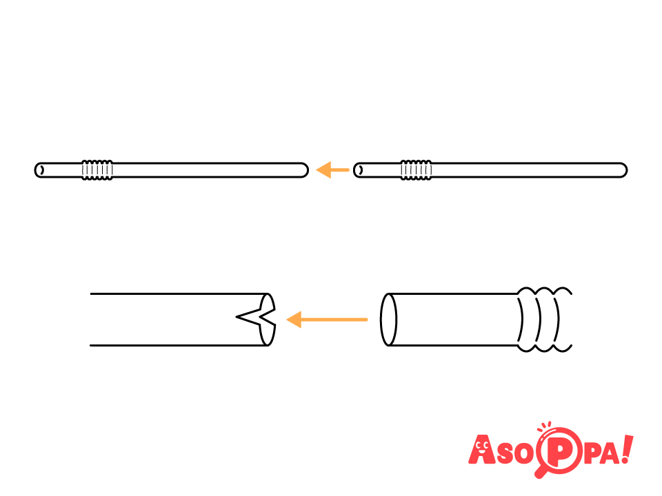 ストローの片側に2箇所切込みを入れ、矢印の向きに差し込む。 -