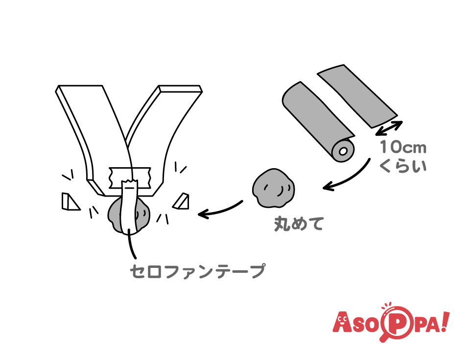 はさみで角を切り落とす。アルミ箔を丸めて玉を作り、セロハンテープで留める。 -