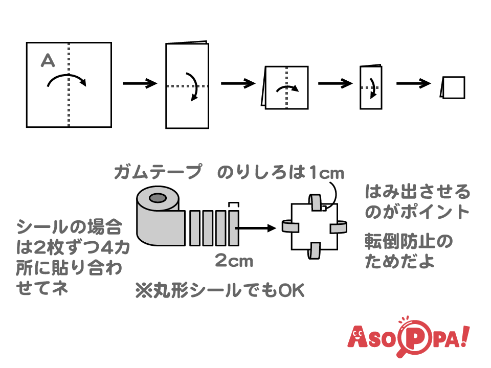 Aを4回半分に折って、小さな正方形にする。2cm幅に切ったガムテープを絵のように正方形からはみ出すように貼り、着地時の座布団を作る。丸型シールの場合は2枚ずつ4箇所に貼り合わせる。 -