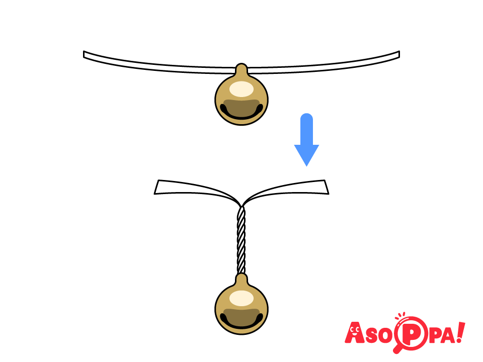 ・鈴はビニール帯でぶら下がるように付けるのが、キレイに音が鳴るコツです。テープで直接貼ったり、カップに当たっていたりするとキレイに音が鳴らないので注意しましょう。