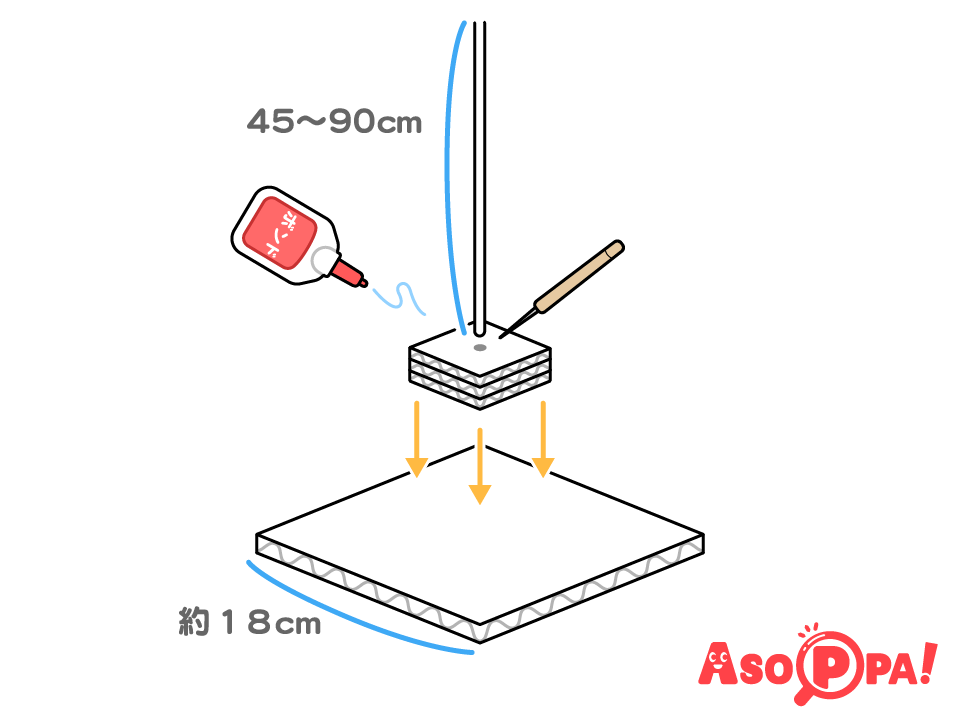 真ん中にきりで穴を開け、18cm四方の正方形のダンボールの中央に貼り付ける。長さ45~90cmに切った木の丸棒を穴に差し込み、木工ボンドを付けて固定する。 -