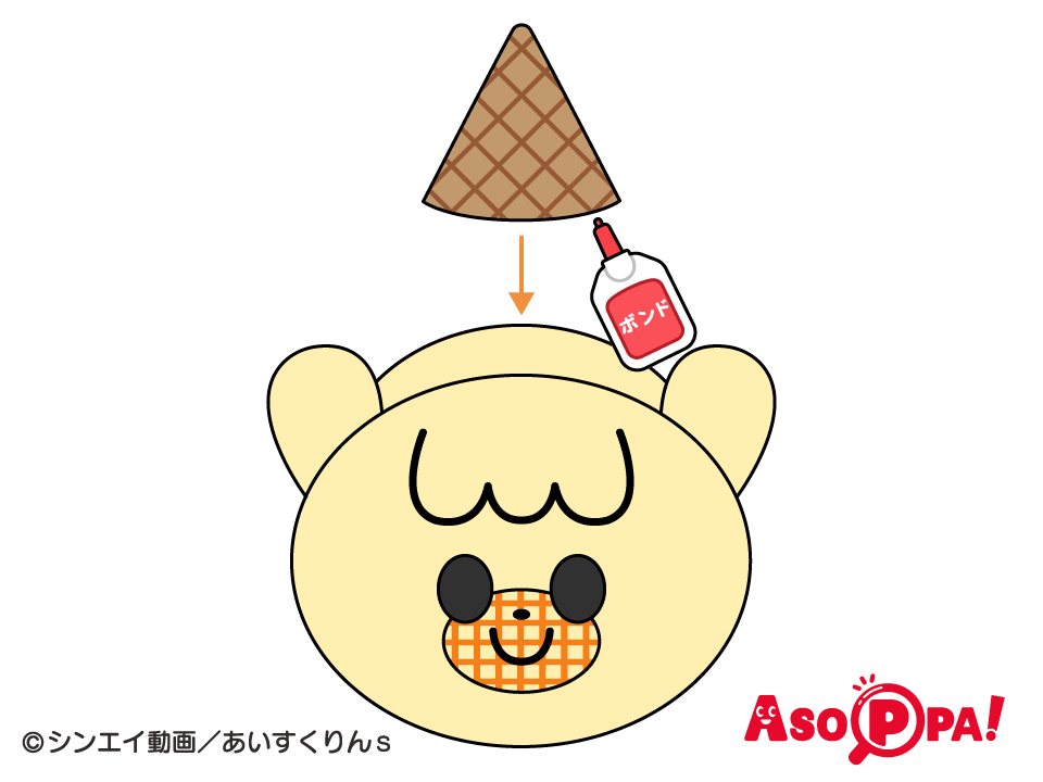・コーンの帽子のポイントは工程⑬!一度平らにつぶして下を切ることで、台紙のカーブした面に沿って貼りやすくなります。ボンドは少し多めに付けて、乾いてから遊んでくださいね。