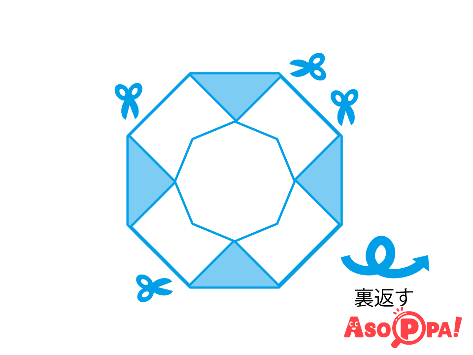 図のように、角を八角形の角に合わせるように谷折りする。 -