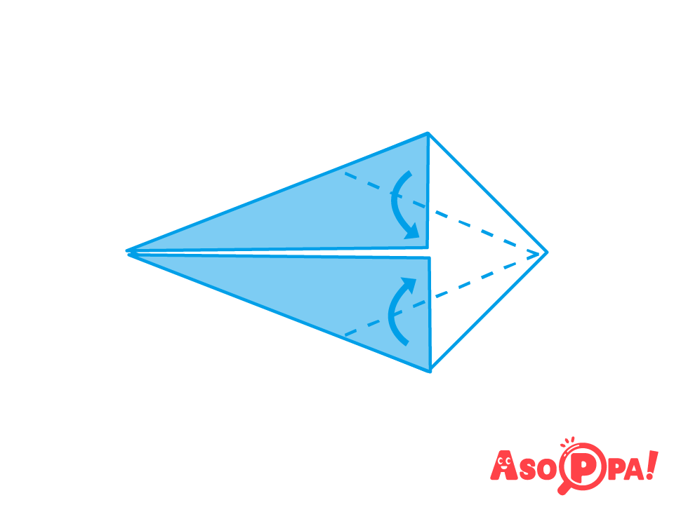 縦に半分に折り、中心線に向かって点線で谷折りする。 -