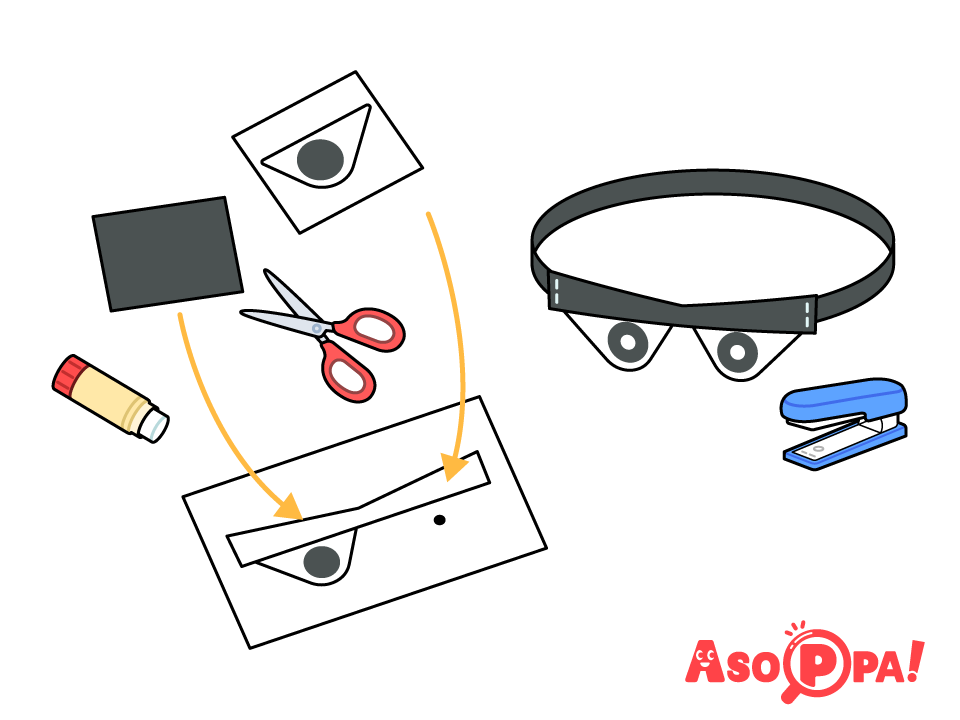 顔に掛けるものなので、ホッチキスを留める際は針の先が顔側にいかないよう後ろから留め、テープなどで留めておくとよいでしょう。