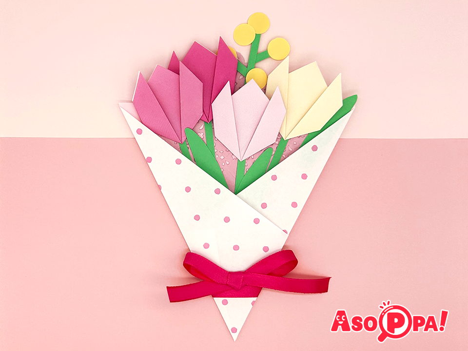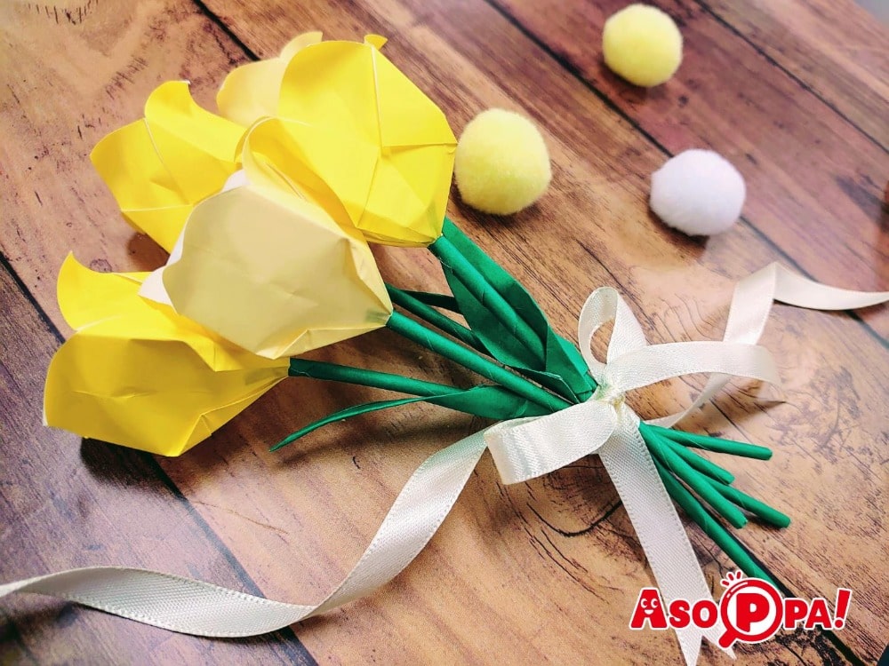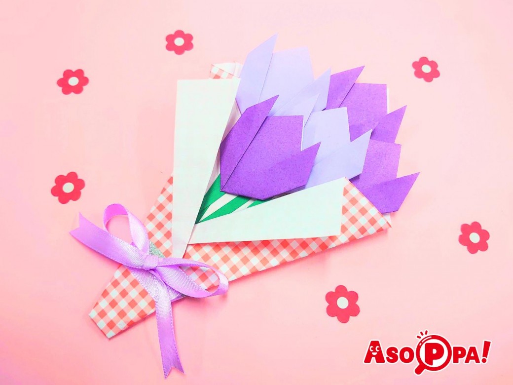 送りものといったらお花。こちらでは簡単に折れるチューリップのご紹介をしています。たくさん作って花束にするととってもかわいいですよ♪ -
