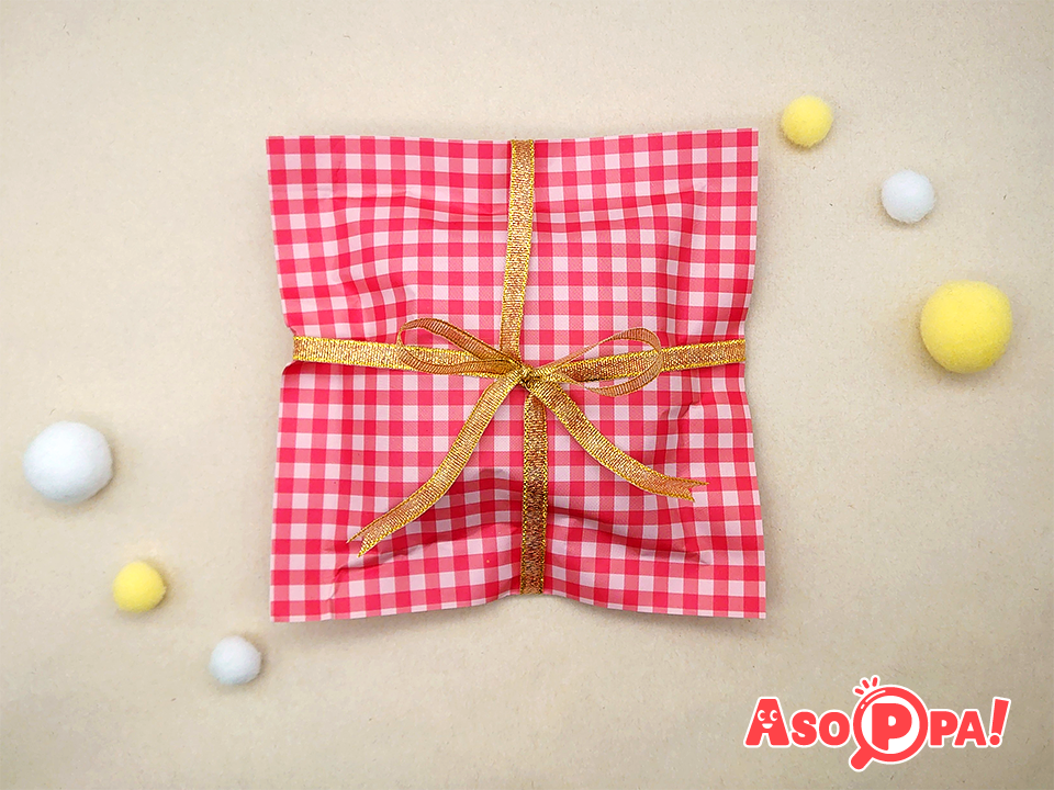 簡単にできるピロー型のラッピングです。中身の大きさや量によって、サイズを調整して包むことができます! -