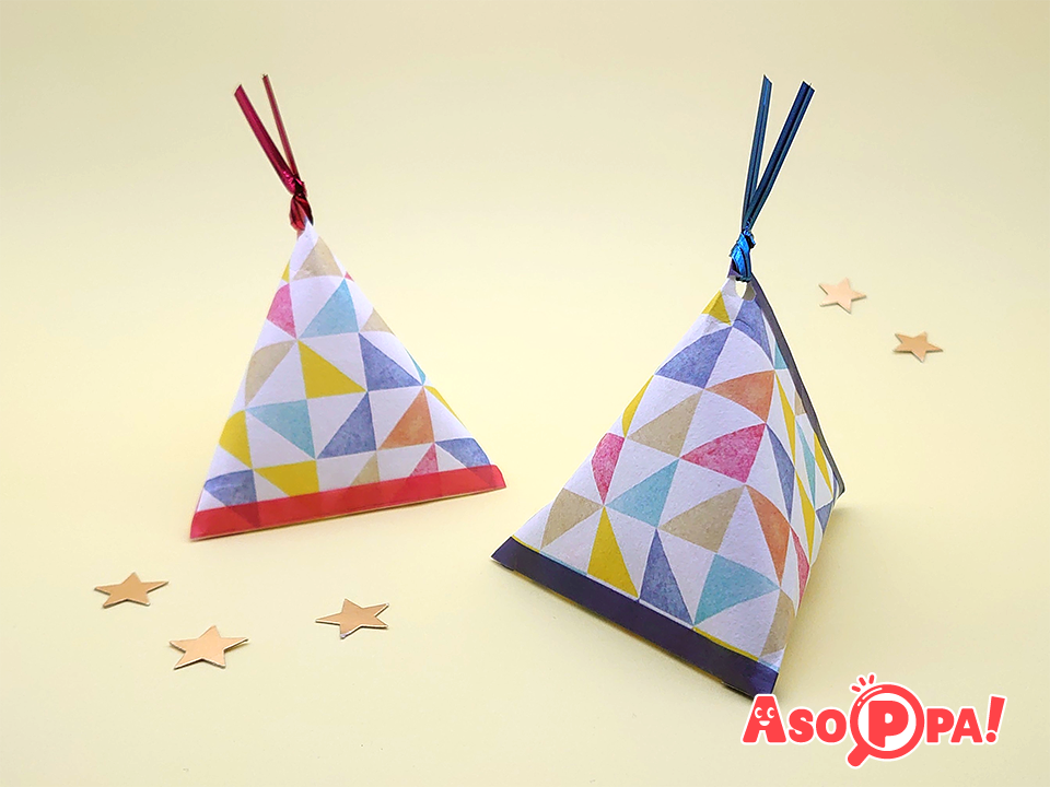 立体的でコロンとした形が特徴的な、テトラ型の包み方です。細かいものをいくつか入れるのにおすすめ! -