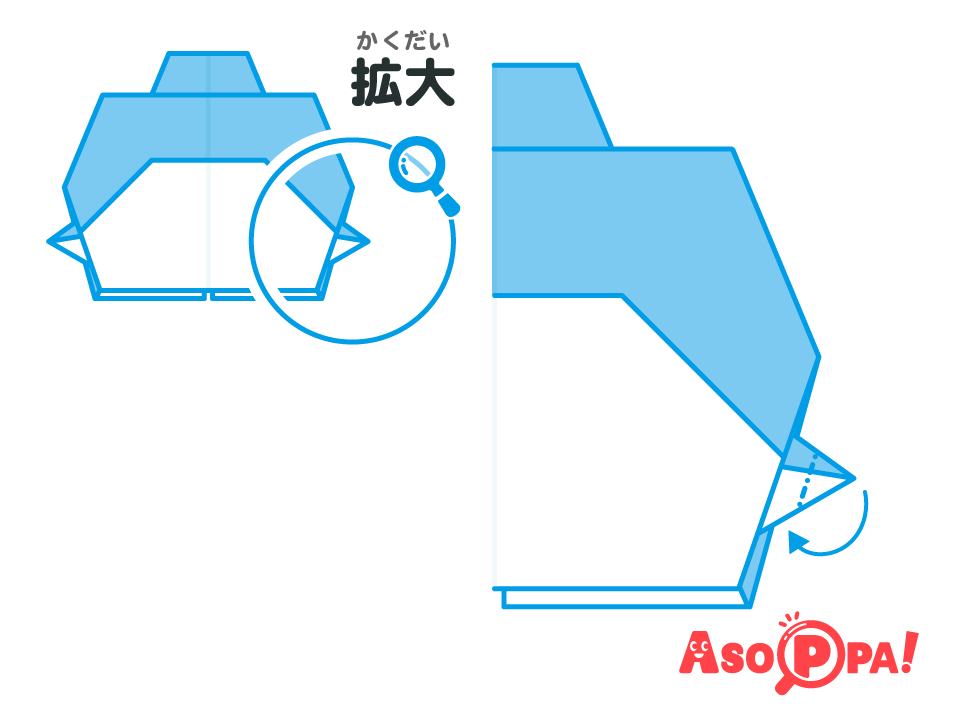 点線で後ろに山折りする。(頭の幅を残して折る)