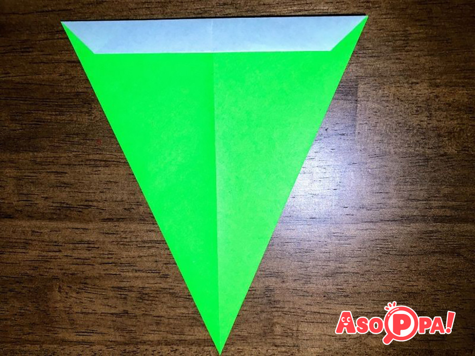 同じように上の辺を折りすじに合わせて折り下げます。 -