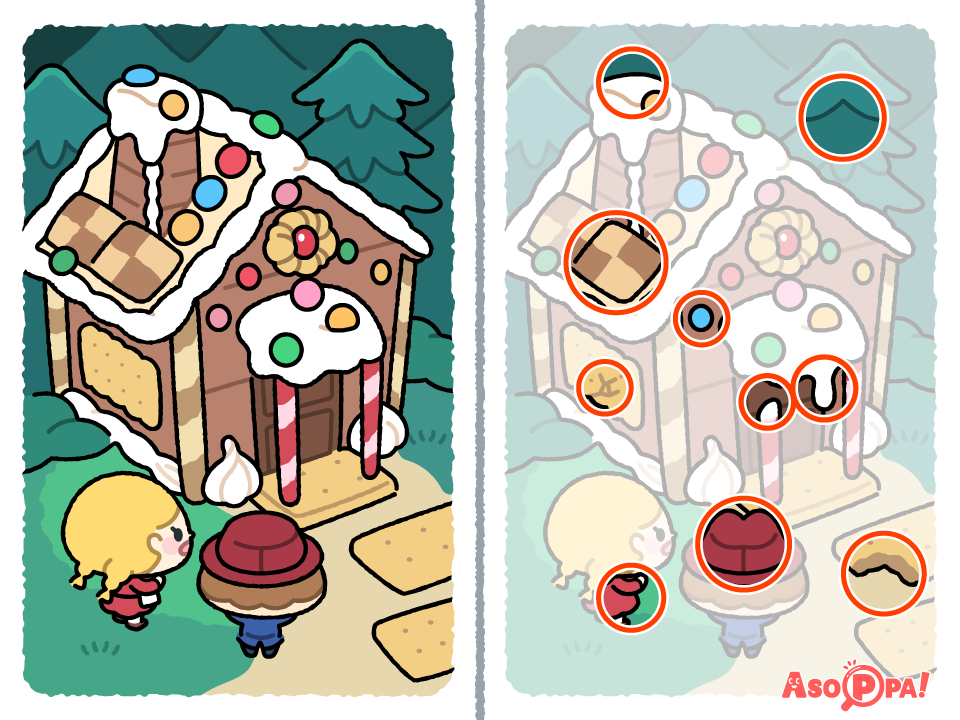 『ヘンゼルとグレーテル』のまちがいさがしだよ~ みぎとひだりのえをみて ちがうところを10こみつけよう!